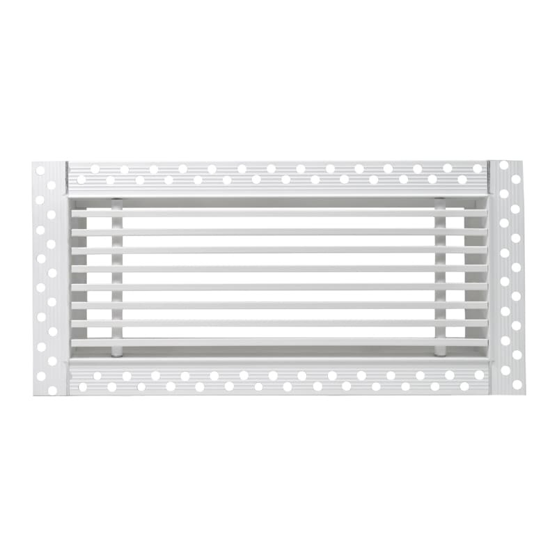 Данная решетка подходит для монтажа на любую поверхность под финишную отделку. Рамка и экран изготовлены из алюминия, опора экрана - из оцинкованной стали. Рама оснащена «полкой» 1,9 мм и рифлеными краями для большей адгезии финишного материала – шпатлевки, цемента. Решетка имеет съемную центральную часть с фиксированным углом наклона ламелей 0°. Она крепится к корпусу прочными металлическими тросиками, легко снимается для очистки и удобного обслуживания.
